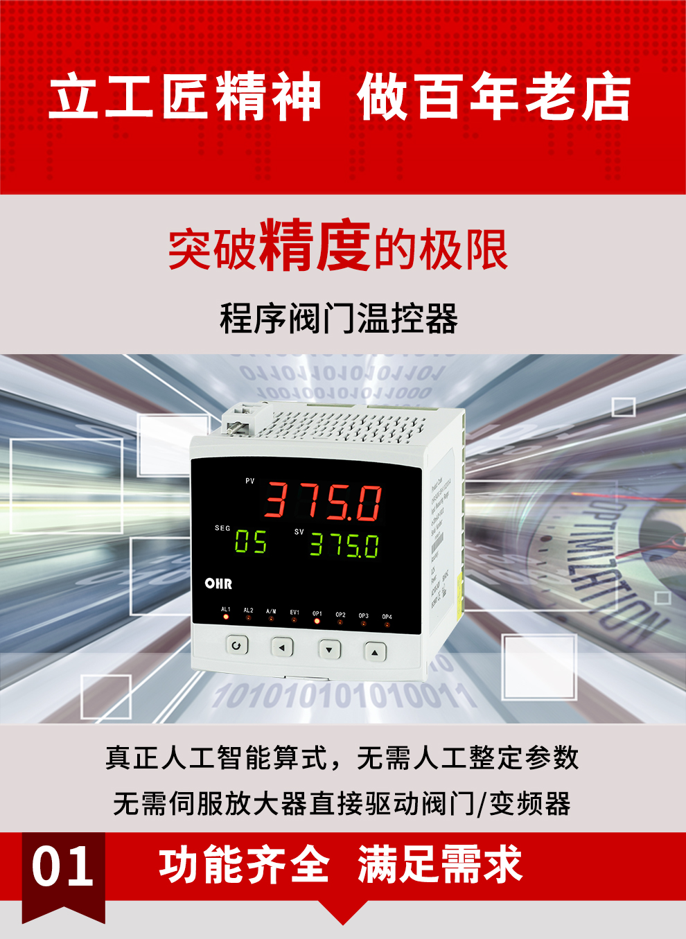 OHR-E401系列程序閥門溫控器/調(diào)節(jié)儀采用真正的人工智能算式,儀表啟動自整定功能,可以根據(jù)被控對象的特性,自動尋找最優(yōu)參數(shù)以達到很好的控制效果,無需人工整定參數(shù)。控溫精度基本達±0.1℃,無超調(diào)、欠調(diào),達國際先進水平。