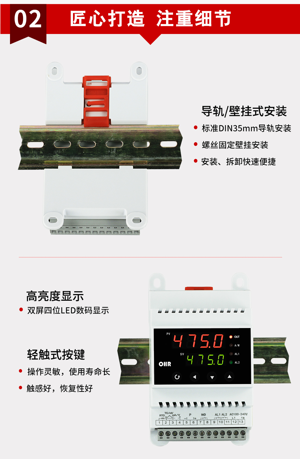 OHR-DN30/DN40系列導軌式智能溫控器/60段程序溫控器采用了表面貼裝工藝,全自動貼片機生產(chǎn),具有很強的抗干擾能力。本儀表采用人工智能算式,儀表啟動自整定功能,可以根據(jù)被控對象的特性,自動尋找參數(shù)以達到很好的控制效果,無需人工整定參數(shù),控溫精度基本達±0.2℃,無超調(diào)、欠調(diào),性價比高。