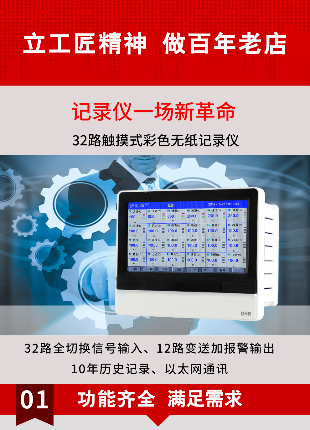 OHR-H700C系列觸摸式彩色無(wú)紙記錄儀用新型大規(guī)模集成電路,對(duì)輸入、輸出、電源、信號(hào)采取可靠保護(hù)和強(qiáng)抗干擾設(shè)計(jì)。32路萬(wàn)能輸入,可帶12路報(bào)警或12路變送輸出,RS232/485通訊接口,以太網(wǎng)接口,微型打印機(jī)和USB接口,SD卡插座;可提供傳感器配電;具有強(qiáng)大的顯示功能,實(shí)時(shí)曲線顯示,歷史曲線追憶等。