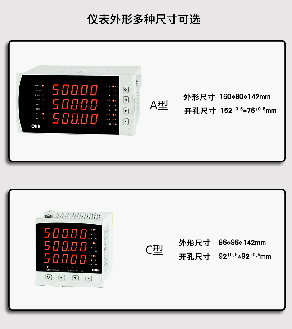 OHR-C300系列三相綜合電量表采用大規(guī)模集成電路和高亮度長壽命的LED顯示器,應(yīng)用數(shù)字采樣技術(shù),對三相電氣線路中的相電壓、線電壓、相電流、線電流、有功功率、無功功率、視在功率、頻率、功率因數(shù)、等進(jìn)行實(shí)時(shí)測量顯示與控制。