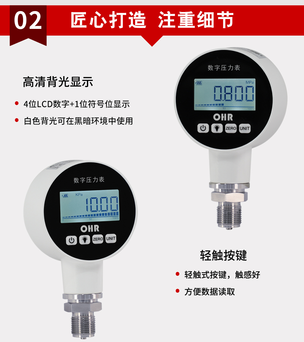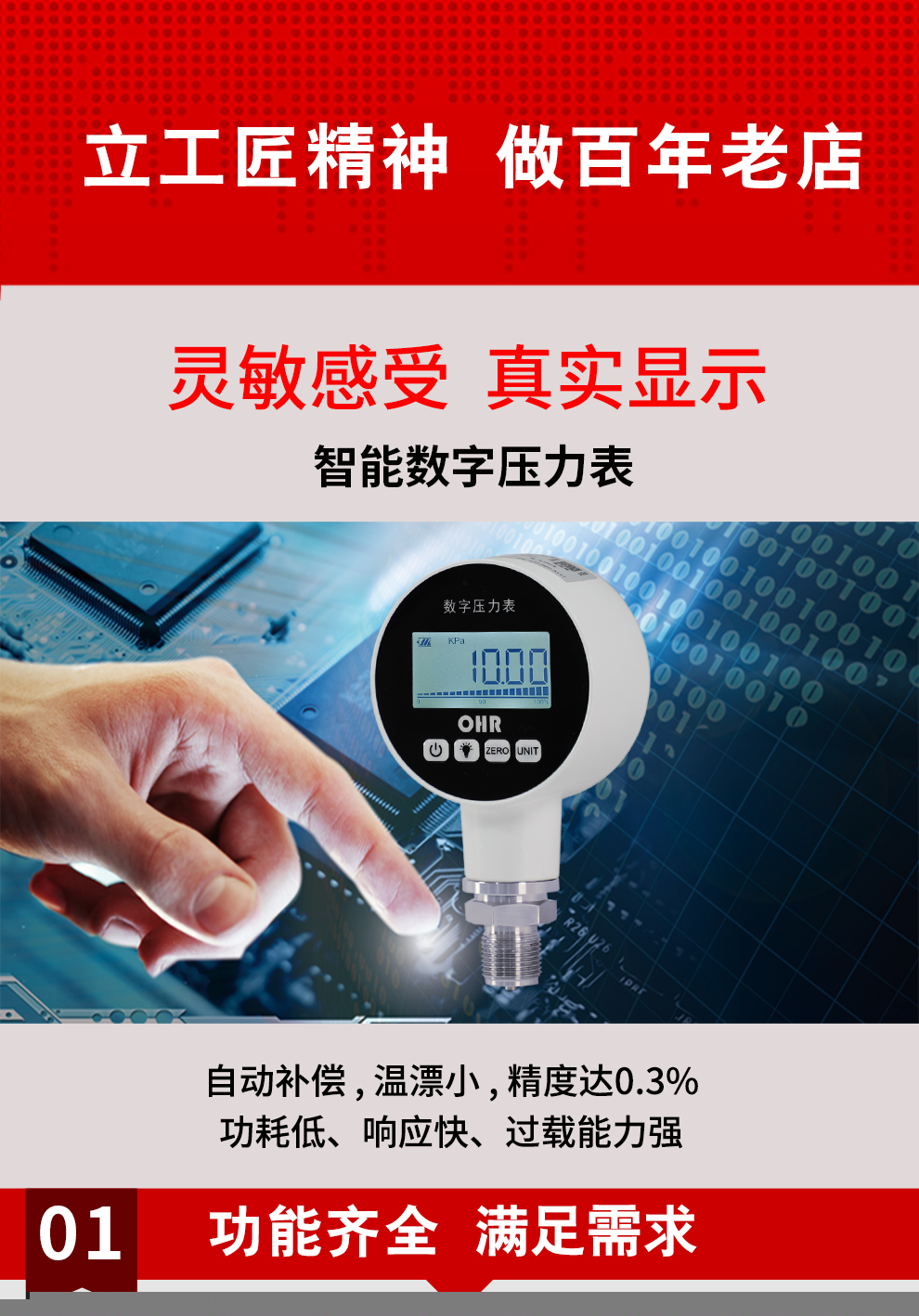 OHR-DP10系列智能數(shù)字壓力表內(nèi)置高精度傳感器,能夠準(zhǔn)確的實(shí)時(shí)顯示壓力,并具有精度高、長期穩(wěn)定性好的 特點(diǎn)。該產(chǎn)品采用鋁合金殼體和不銹鋼接頭,抗震性好,能夠測量氣體、液體、油等介質(zhì);具有一鍵清零、峰值 谷值記錄、量程百分比棒圖顯示、單位切換等功能;適用于便攜式壓力測量、設(shè)備配套、 校驗(yàn)設(shè)備等壓力測量領(lǐng)域。