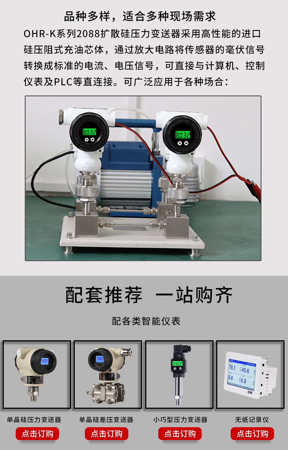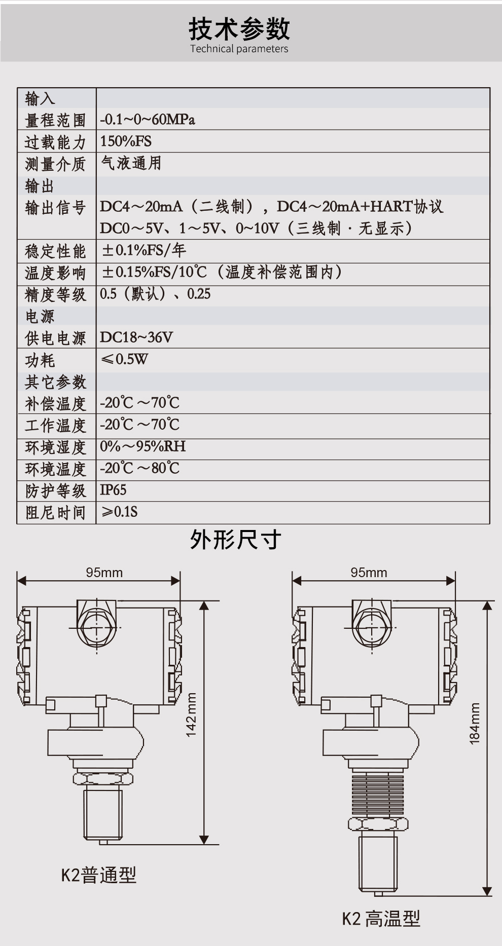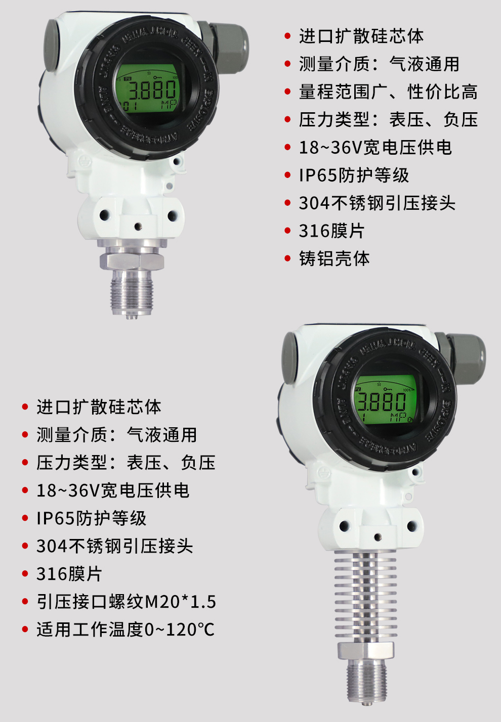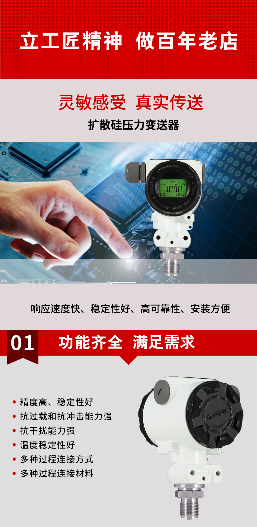 K系列壓力變送器采用具有國際先進水平的擴散硅傳感器,配合高精度電子元件,經(jīng)嚴格的工藝過程裝配而成。充分發(fā)揮了傳感器的技術(shù)優(yōu)勢,使該系列壓力變送器具有優(yōu)異的技術(shù)性能。該變送器抗過載和抗沖擊能力強、溫度漂移小、穩(wěn)定性高,具有很高的測量精度。