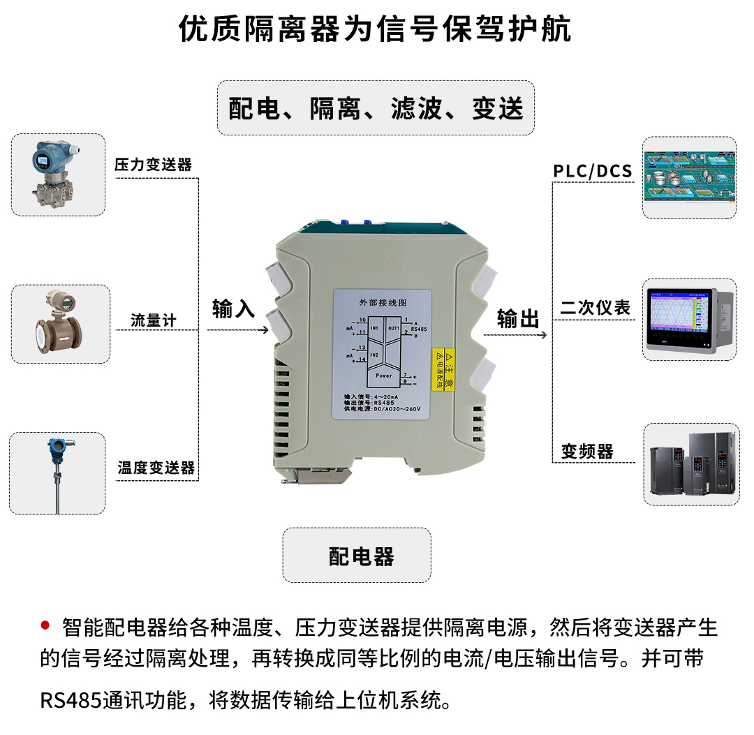 NHR-X33系列導(dǎo)軌式智能配電器給二、三線制變送器提供隔離的電源電壓,將變送器產(chǎn)生的直流電壓電流信號,經(jīng)本隔離器轉(zhuǎn)換成所需的輸出信號至控制系統(tǒng)。寬電源設(shè)計:20-260V交直流供電。配置高清顯示單元,通過輕觸按鍵設(shè)置每個通道的參數(shù)及每個通道之間的切換。