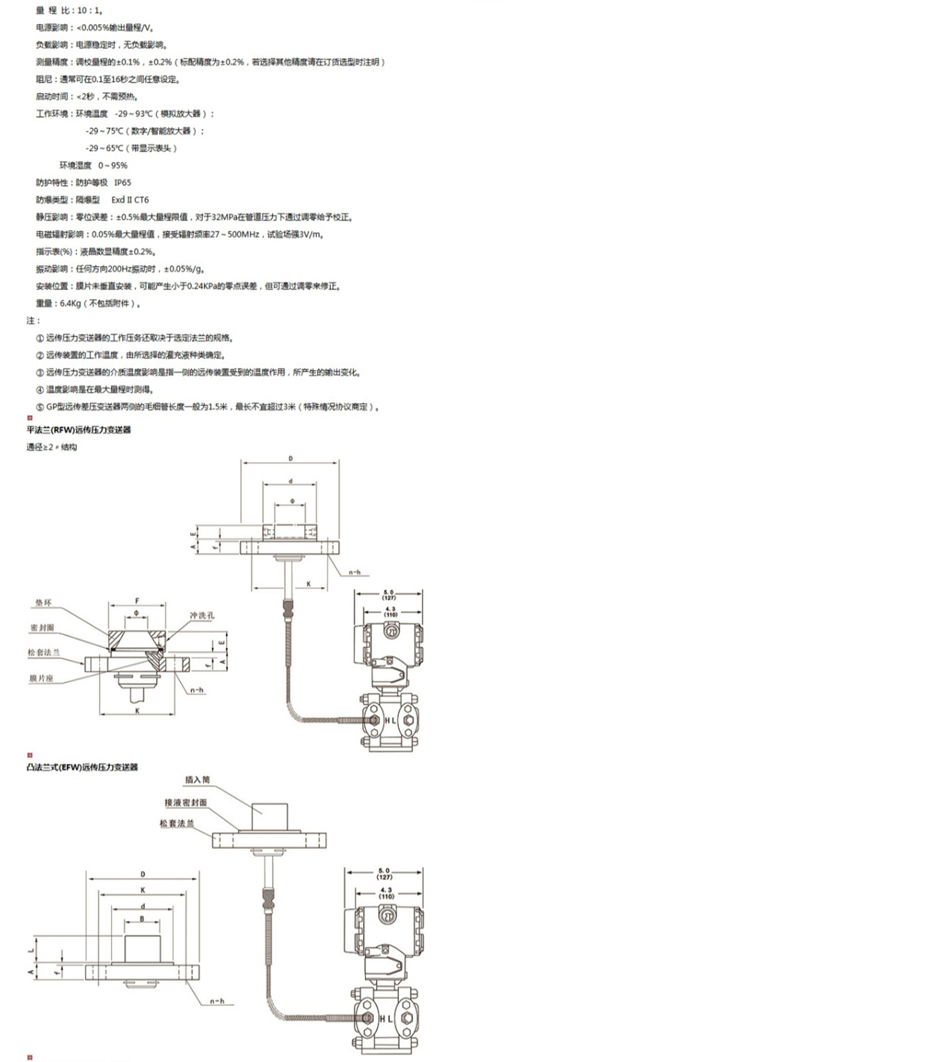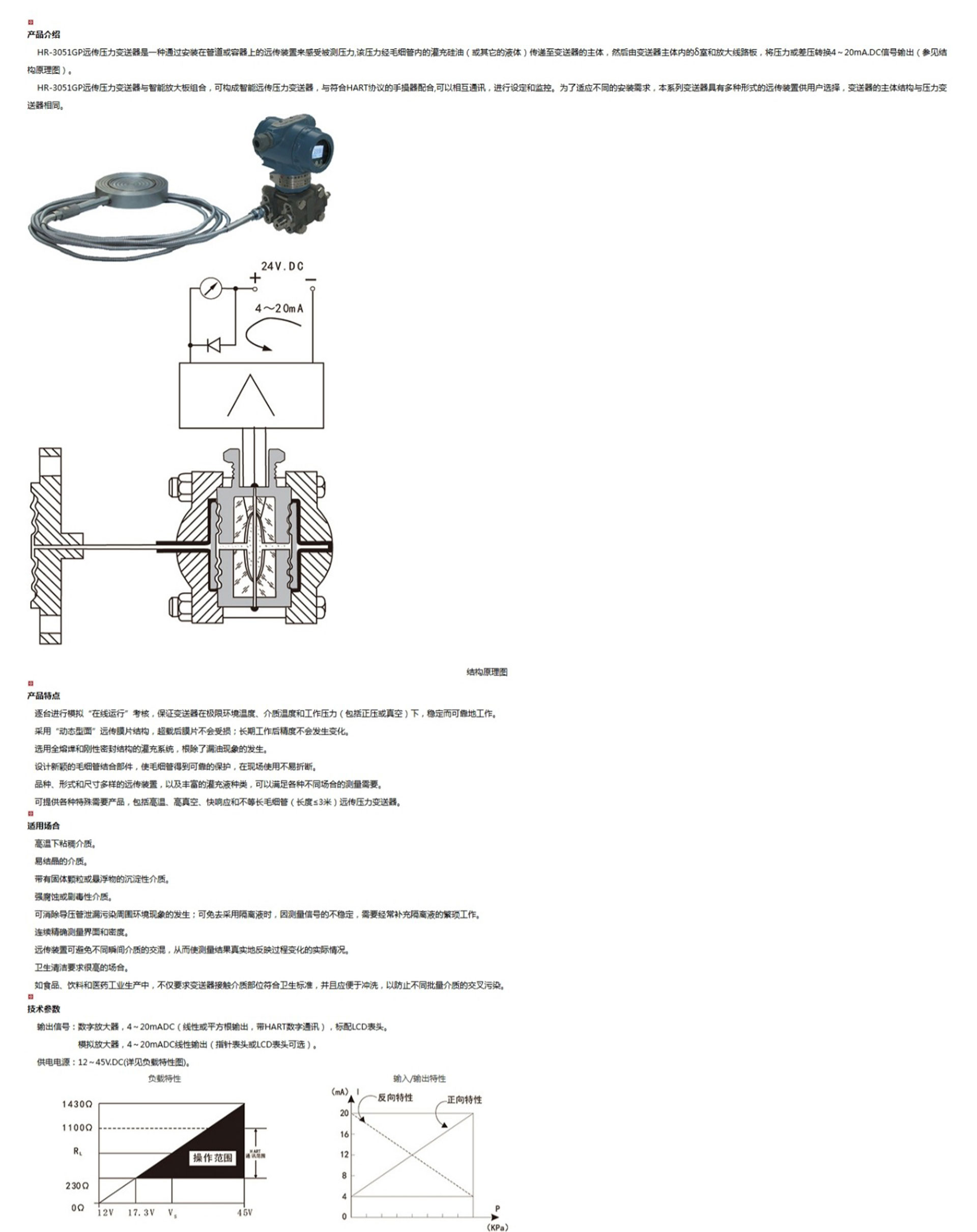 HR-3051GP遠傳壓力變送器是一種通過安裝在管道或容器上的遠傳裝置來感受被測壓力,該壓力經(jīng)毛細管內的灌充硅油(或其它的液體)傳遞至變送器的主體,然后由變送器主體內的δ室和放大線路板,將壓力或差壓轉換4~20mA.DC信號輸出。