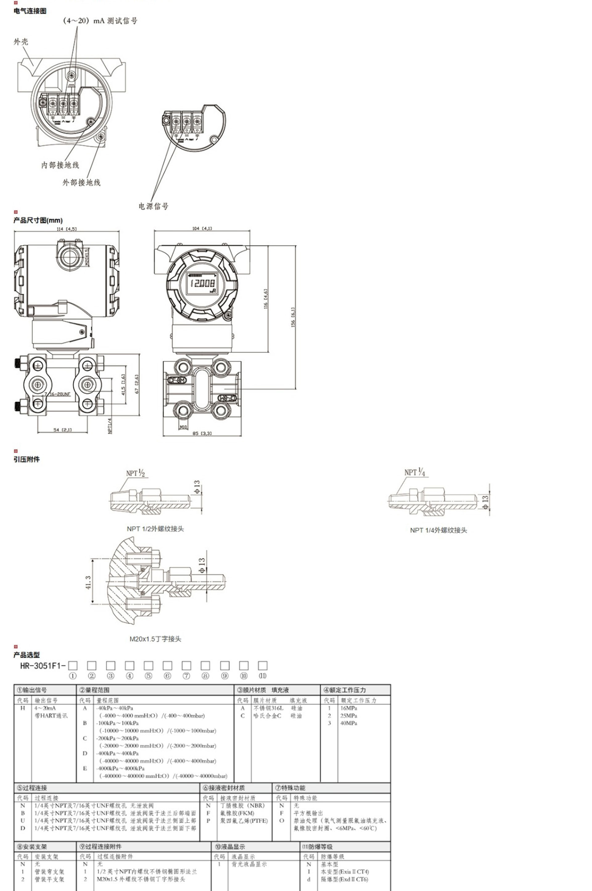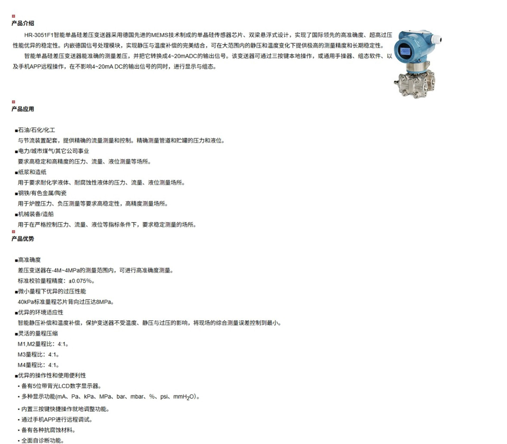 HR-3051F1智能單晶硅差壓變送器能準(zhǔn)確的測量差壓,并把它轉(zhuǎn)換成4~20mADC的輸出信號。該變送器可通過三按鍵本地操作,或通用手操器、組態(tài)軟件、以及手機(jī)APP遠(yuǎn)程操作,在不影響4~20mA DC的輸出信號的同時(shí),進(jìn)行顯示與組態(tài)。
